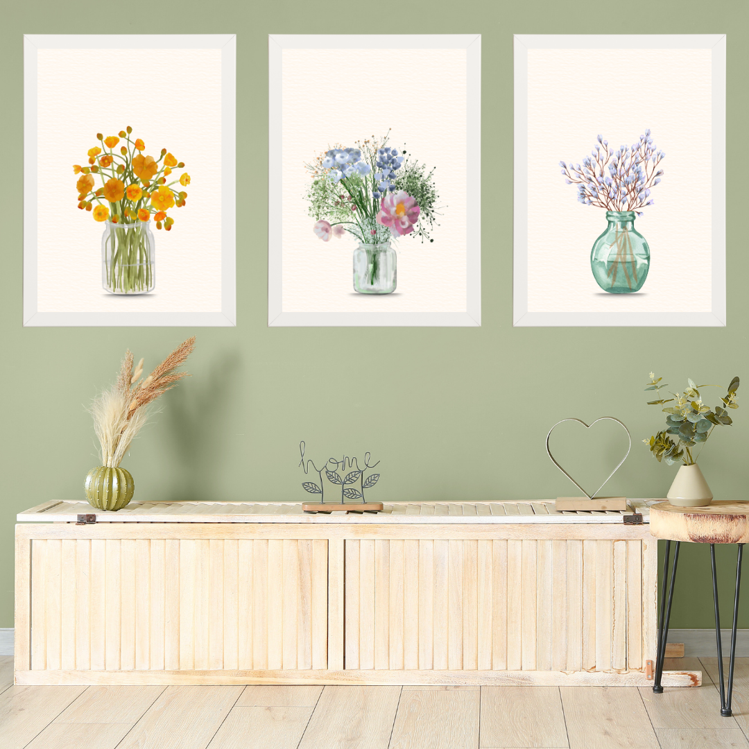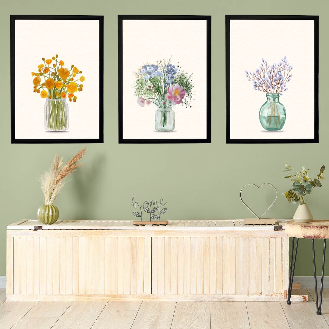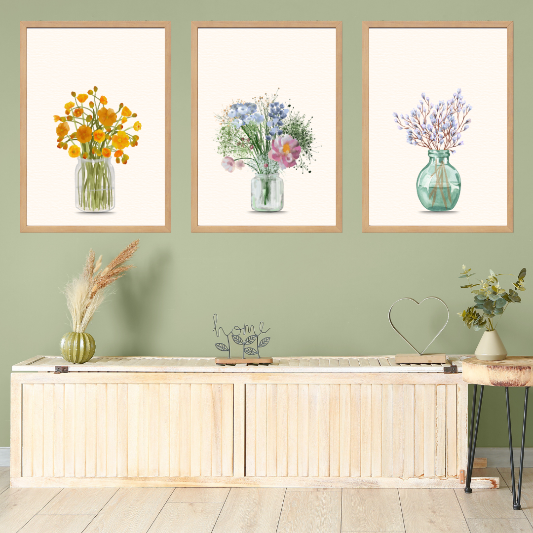 Vazoda Çiçek 3'lü Set Ahşap Çerçeve Oda-Mutfak Tablosu